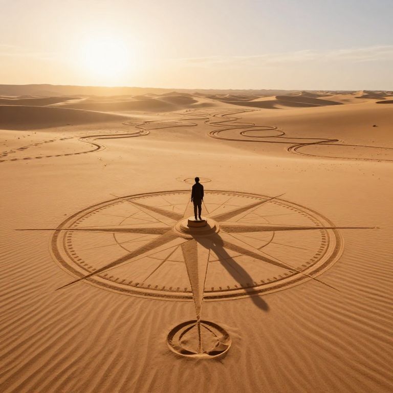 In a desolate expanse where sand and sky merge under the relentless sun, travelers stand upon a colossal compass etched into the earth, their shadows stretching like silent prayers toward an unseen horizon, embodying the paradox of seeking direction in a world where paths dissolve into endless loops of uncertainty and introspection.