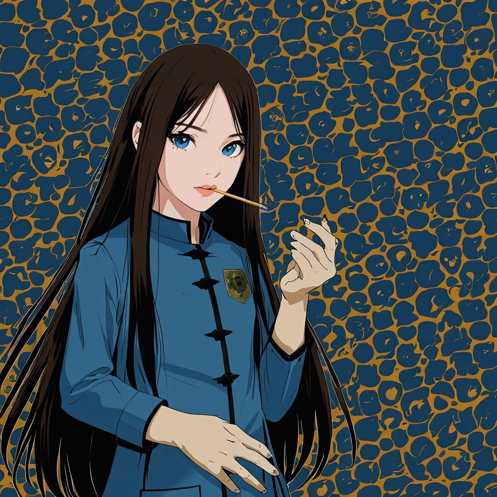 Illustration of an anime girl with long black and brown hair, bright blue eyes, and a traditional blue outfit with black accents. She holds a cigarette in her mouth, set against a textured dark blue and brown leopard print background. The artwork is styled in the manner of the World Witches series.