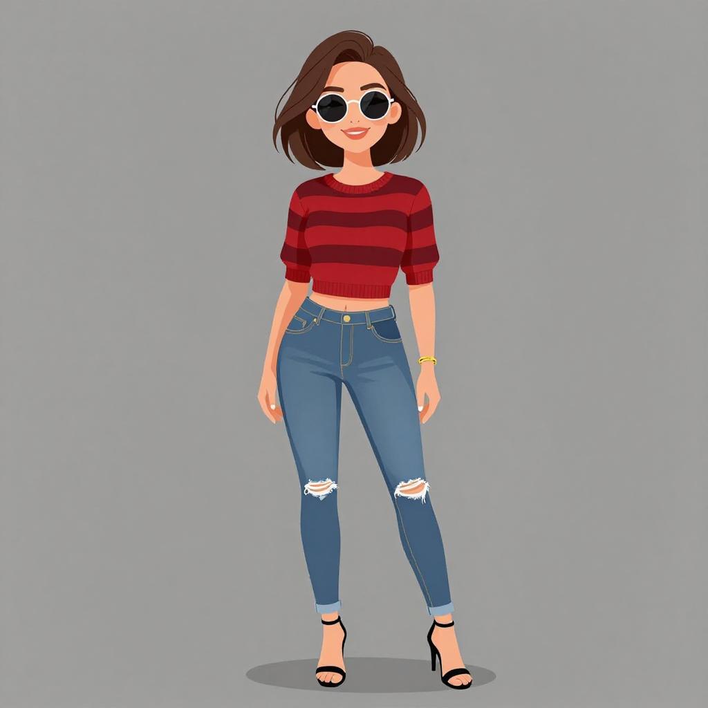 Digital illustration of a woman with brown bob, wearing round sunglasses, red striped crop top, blue ripped jeans, and black heels.