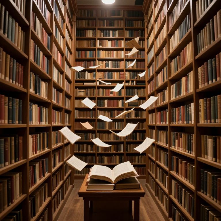 Photograph of a narrow library aisle filled with tall, wooden bookshelves on both sides, lined with a variety of books in different colors and sizes. Midway up the shelves, numerous white paper sheets are floating in the air, creating a sense of motion. At the forefront, an open book rests on a wooden table, suggesting active reading or study. The warm, ambient lighting casts a soft glow, enhancing the cozy, scholarly atmosphere. The image captures a whimsical, almost magical moment within a traditional library setting.