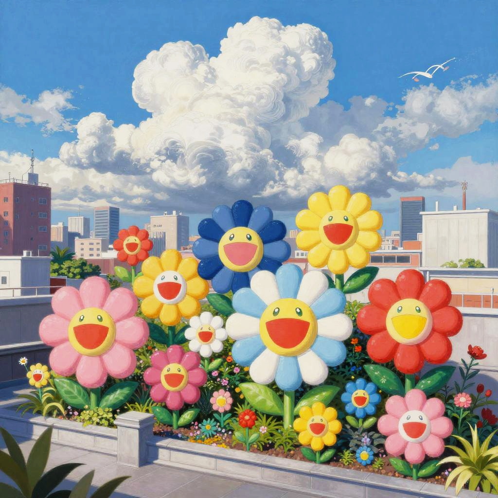 A painting by Takashi Murakami of a vibrant urban rooftop garden bursting with colorful oversized flowers. Bright sunny day with dramatic white cumulonimbus clouds building in the distance, intricate and hyper-realistic