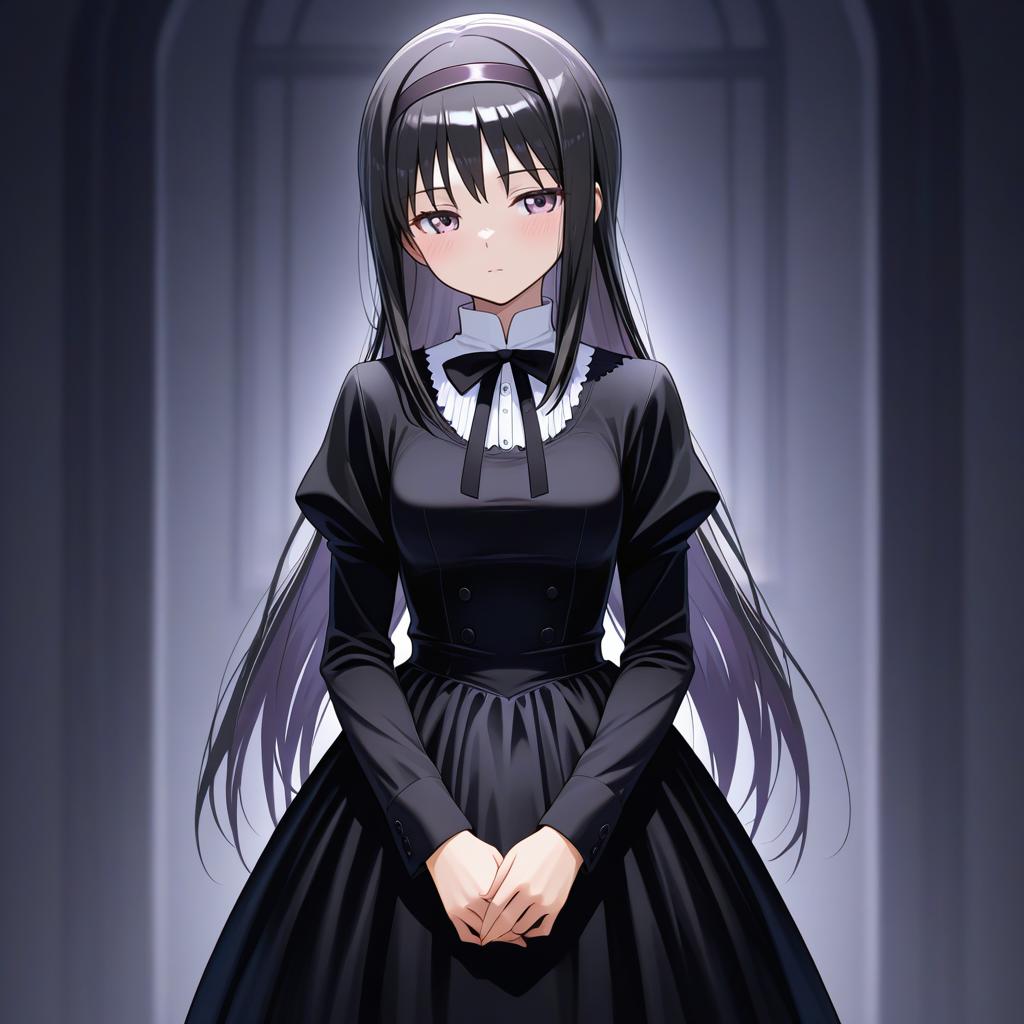 Akemi homura (black dress), mahou shoujo madoka magica, 1girl, purple eyes, black hair, long hair, hairband, funeral dress, by artist nabe puyo, illustrious