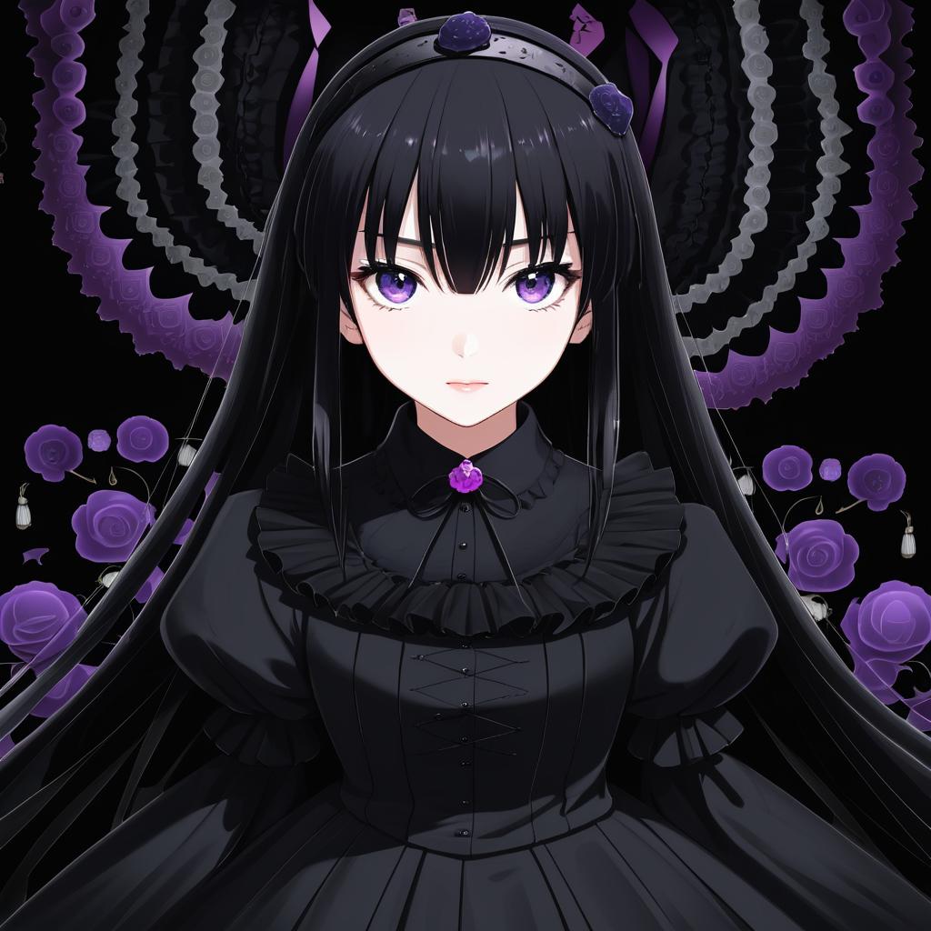 Illustration of an anime-style girl with long black hair and purple eyes wearing a black funeral dress with a white collar and a black bow tie, standing with hands clasped. The character has a hairband and a somber expression, rendered in a detailed and polished style by artist Nabe Puyo.