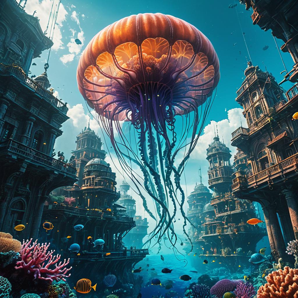 Ultra-photorealistic digital painting of gigantic steam-powered jellyfish floating above an expansive underwater coral city. The scene features intricately detailed ancient-style buildings integrated with coral reefs and vibrant marine life, showcasing a fusion of steampunk and natural elements. The artwork uses a rich color palette and cinematic lighting to highlight the surreal atmosphere in 8K resolution.