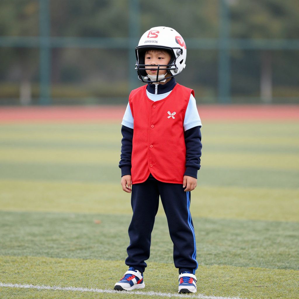 Sport Costume Boy, boy wearing a helmet and a red vest standing on a field