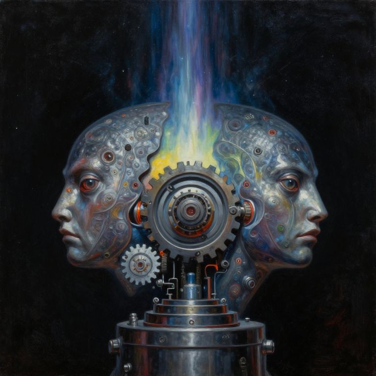 Digital artwork depicting a side-by-side profile of a human head with exposed mechanical internals. The left side of the head shows a metallic, gears-and-cog mechanism centered at the forehead, emitting a bright, multicolored light. The right side of the head is more organic, with visible skin texture and eyes. The background is dark, highlighting the contrast between the mechanical and organic elements. The artwork combines cyberpunk and sci-fi styles, with intricate details and a futuristic, high-tech aesthetic. The image focuses on the intersection of human and machine, symbolizing fusion or transformation.