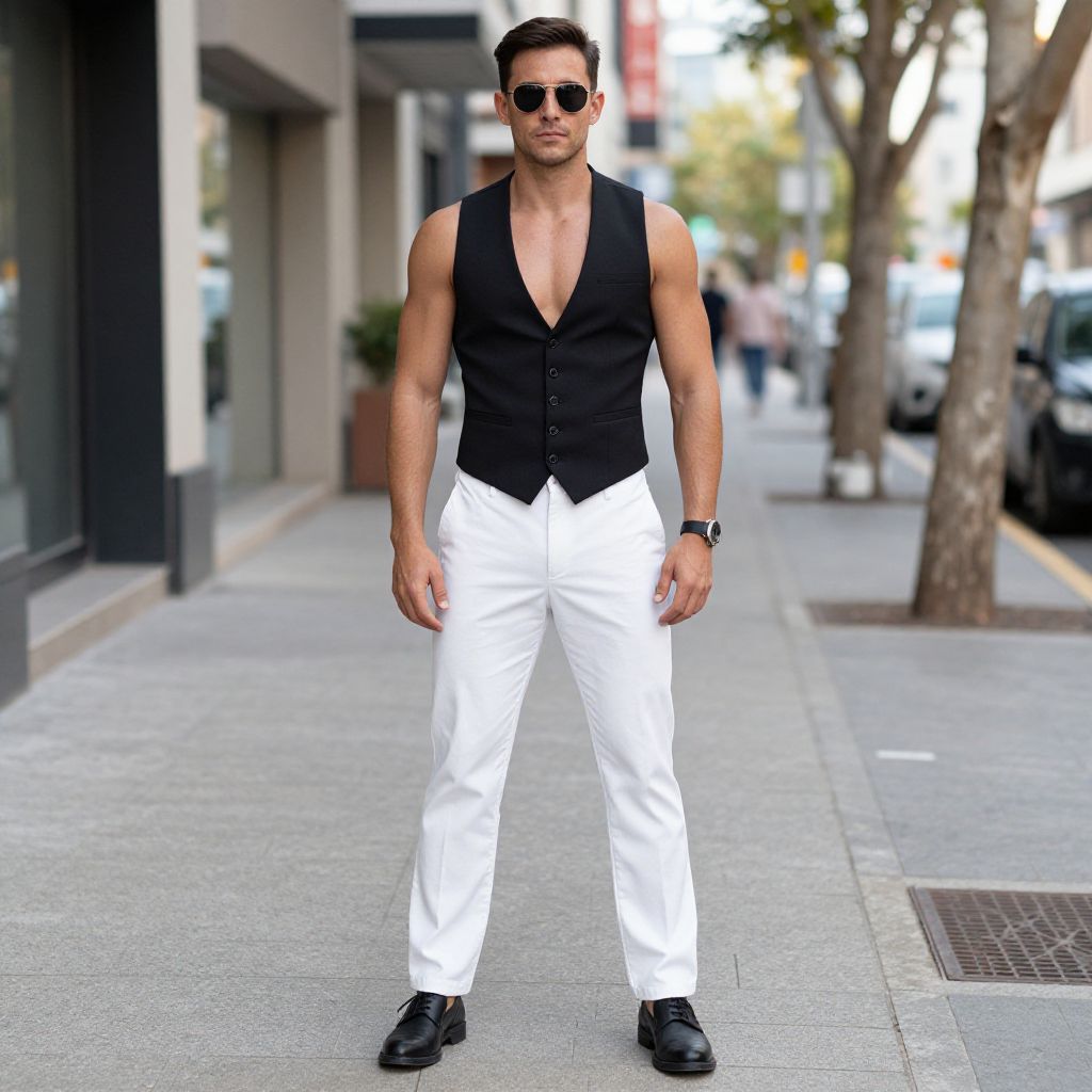 Photograph of a fit, muscular man with short, dark hair and tan skin, standing on a city sidewalk. He wears dark aviator sunglasses, a sleeveless black vest with a deep V-neck, and white, tailored pants. His black leather shoes are polished. He has a black watch on his left wrist. The background shows a blurred urban street with trees, parked cars, and buildings with large windows. The sidewalk is light gray, and the overall scene is brightly lit. The man's confident stance and stylish outfit exude a modern, urban vibe.