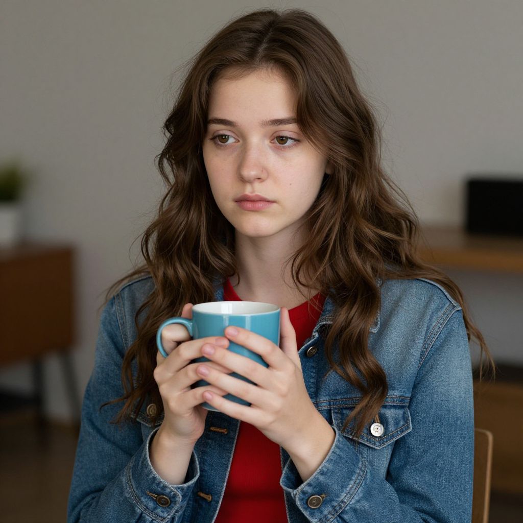Photograph of a young woman with long, wavy brown hair and fair skin, sitting in a cozy indoor setting. She's wearing a red top under a denim jacket and holding a blue mug with both hands. Her expression is calm and slightly pensive. The background is slightly blurred, featuring soft lighting and some indistinct furniture. The overall vibe is relaxed and casual.
