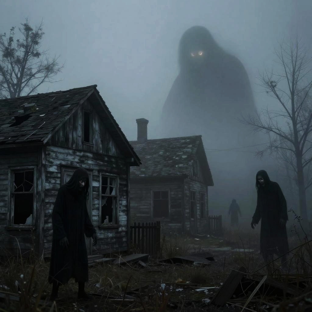 Digital artwork depicting a shadowy, menacing figure with glowing red eyes walking down a dimly lit, narrow hallway. The figure, cloaked in dark, tattered clothing, holds a glowing lantern in its right hand. The hallway walls are dark, with greenish light from an overhead fixture casting an eerie glow. The floor is littered with debris, and the doorframes are slightly worn. The overall atmosphere is spooky and foreboding, with the lantern's light creating stark contrasts against the dark surroundings. The style is reminiscent of horror-themed digital art.