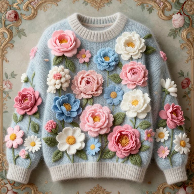 Photograph of a light blue, knitted sweater adorned with colorful, detailed fabric flowers in pink, white, and blue, set against an ornate
