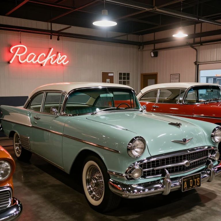 Classic autos displayed in a bustling 1950s-style garage, retro signage, immaculate chrome detailing, atmospheric lighting with soft lens flares, rich color palette, hyper-detailed interior scene