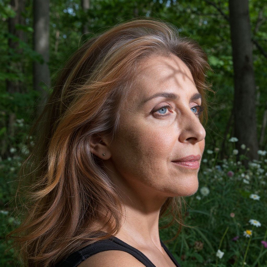 A hyper-realistic portrait captures the serene yet intense gaze of a middle-aged Middle Eastern woman. Her gentle blue eyes, framed by a thick mane of silver-streaked auburn hair, hold a steady gaze, her hair flowing freely in the wind. The unusual side-view angle showcases a powerful jawline and refined cheekbones, while a subtle smile hints at both vulnerability and strength. Sunlight filters through a dense canopy, casting dappled light upon her face and creating intricate shadows across her sun-kissed skin, each mark a testament to life's challenges and victories. The surrounding forest, an ethereal backdrop of lush green foliage and delicate wildflowers, reflects the subject's deep connection to nature and the passage of time, blending seamlessly into the atmosphere.