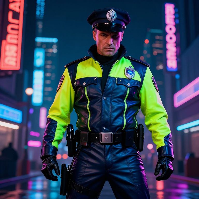 Photorealistic image of a stern-faced male police officer in neon yellow and black uniform, standing in a vibrant, neon-lit city street at night