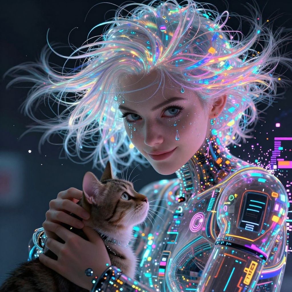 Extreme Cyberpunk Adult Aesthetic, mixed with Glitch-core style mixed with pixel dissolving style, with the presence of some mystical epic wind, dissolving of body in tiny pixels that fly away with the wind and glowing energy.Accurate and detailed and serious and dramatic action photo of a sweet "Roscharc" from the movie "Watchmen" petting a small cat.Intense eyesight, subtle smile, stares the viewer.Glitchy, bio-luminescent, iridescent, glowing hair.Hair are made of glowing iridescent optic fibers.Bio-luminescent drops of tears come from the eyes of "Roscharc". Tears of joy.Outfit parts are made from neon and transparent glass.Upper body is visible.Glowing multi-color piercings are present.Pristine Aesthetic.Life-like details.Cinematic. Dramatic. Dynamic. Ironic.Extremely refined lines and and shapes.Extremely refined details on objects.Sharp details.Wide range of colors.Many details everywhere. Ray-Tracing. Anti-Aliasing. Realistic soft shadows. Low saturation colors. Insane quality. Insane resolution. Insane details. Masterpiece. 32k resolution.