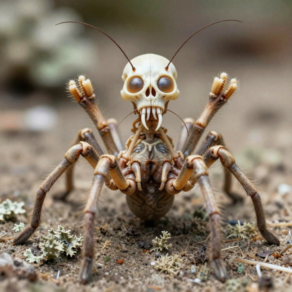A unique biofused coral-lichen octopedal arachnid with a skeletal head, long antennae, two compound sunken light brown eyes, indented jaw filled with tendrils, two short, large arms, skinny thorax with thick waist, elongated short, stocky abdomen, and eight short powerful legs ending in three-toed feet
