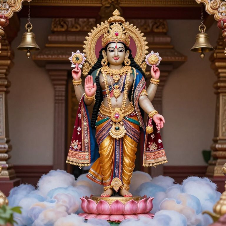 Venkateswara figure standing on a lotus pedestal amidst clouds, draped in richly embroidered garments and intricate gold ornaments, holding symbolic items, with temple bells and hanging lamps in the background, showcasing a divine and peaceful atmosphere.