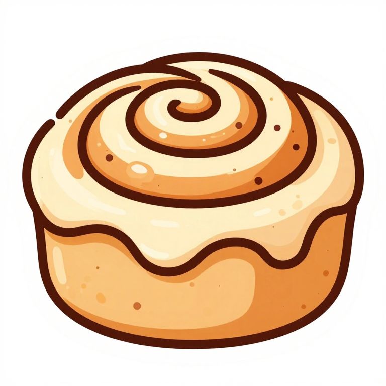 Cinnamon bun clipart, a single fluffy cinnamon roll with sugary glaze dripping, stylized illustration with bold lines and vibrant colors, playful and cute design, perfect for stickers or greeting cards