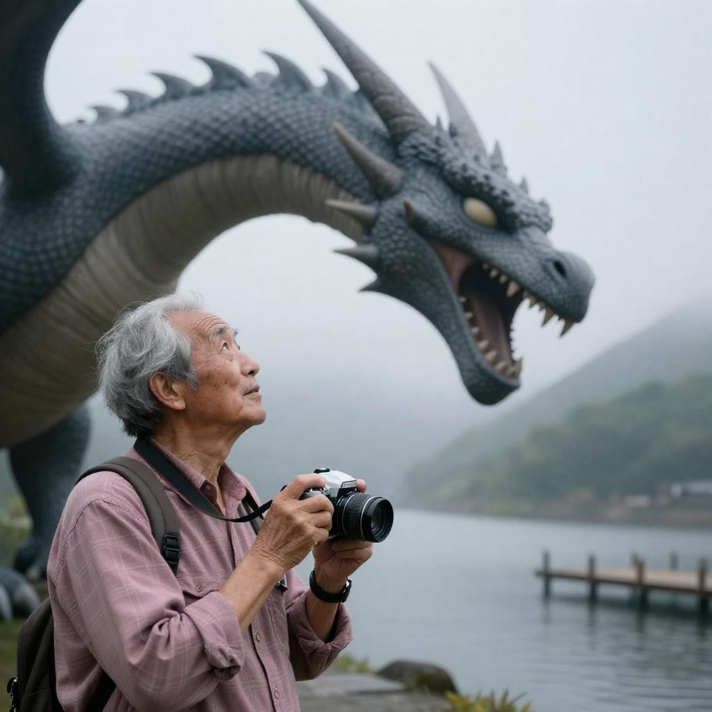 Old man with gray hair, wearing a pink plaid shirt, holding a camera, looking up at a large, gray, dragon-like creature with a snarling mouth. Overcast sky, misty mountains, lake, and dock in the background. Creature's head is prominently to the right.