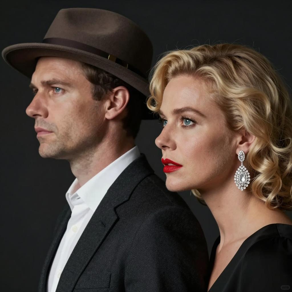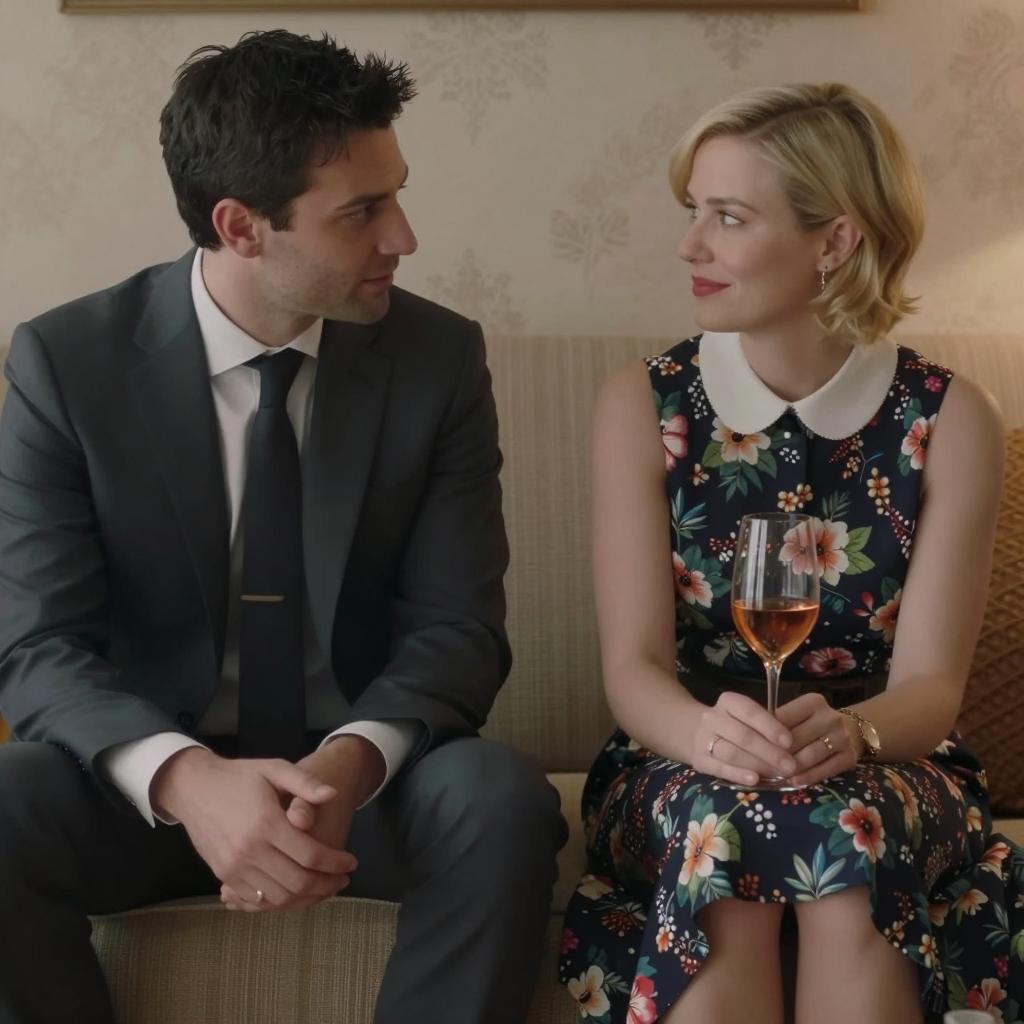 Photograph of a stylish couple sitting on a brown leather tufted couch. The man has short brown hair and is dressed in a black jacket, white shirt, black pants, and a necklace with a black pendant. The woman has blonde hair styled in waves, wearing a blue dress with purple straps, red lipstick, and a necklace with a black pendant. The man has his arm around the woman's shoulder. Warm yellow lighting enhances the cozy atmosphere.