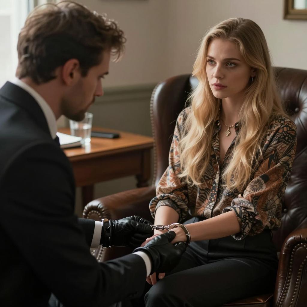 Woman with long brown hair, wearing a patterned blouse, sits on the floor with intense expression, facing a man in a black suit. Man leans towards her, hands on her wrists. Background: wooden desk, black rotary phone, wine glass, small box. Woman's right hand rests on her knee, left arm between legs. Man's back to camera, face partially visible. Two people.