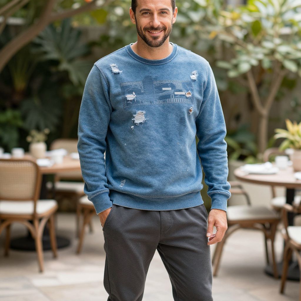 A man, vintage-inspired graphic sweatshirt, faded denim blue, distressed details, relaxed fit, charcoal gray jogger pants, breathable cotton fabric, tapered leg design, sunlit garden patio, casual and inviting, soft focus, smiling expressionMan has masculine face and piercing eyes