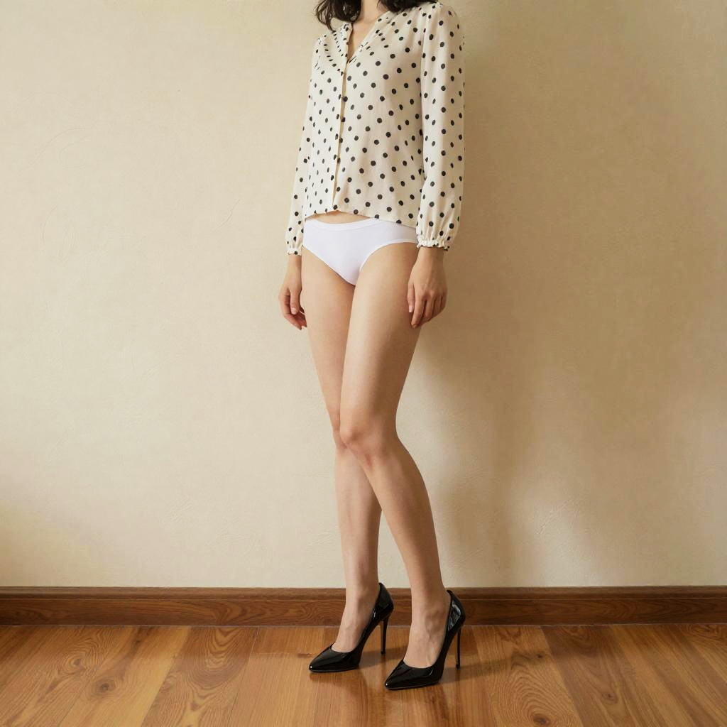 A woman posing indoors against a muted olive green plaster wall with mild texture, wearing a polka dot blouse, white underwear, and shiny black high-heeled shoes, colorful patterned ceramic tiles floor, warm lighting highlighting skin and textures, cozy rustic atmosphere