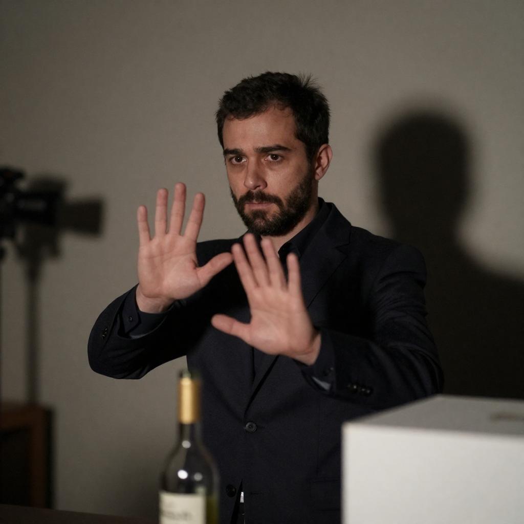 Photograph of a man with short black hair and beard, wearing a dark suit, standing in a dimly lit room, hands raised defensively. Shadow of a camera on the wall. Bottle in the foreground. White box in bottom right. One person. Intense facial expression.