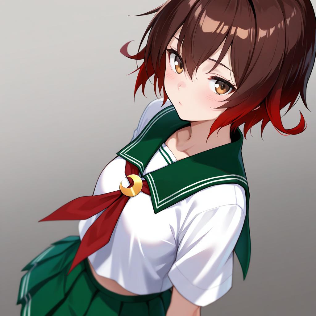 Mutsuki kai ni (kancolle), kantai collection, 1girl, red eyes, brown eyes, short hair, brown hair, gradient hair, red hair, serafuku, serafuku, green skirt, pleated skirt, green sailor collar, crescent pin, red neckerchief, by artist haruakira, illustrious