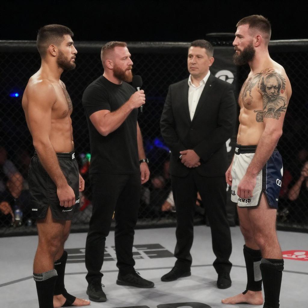 Photograph of a MMA fight scene: a bearded, muscular man with tattoos on his left arm and a trimmed beard stands shirtless on the left, facing a shirtless, younger man with short brown hair on the right. A middle-aged man with a beard and black shirt, wearing black gloves, stands between them, gripping their shoulders. The background is dark with faint lights.