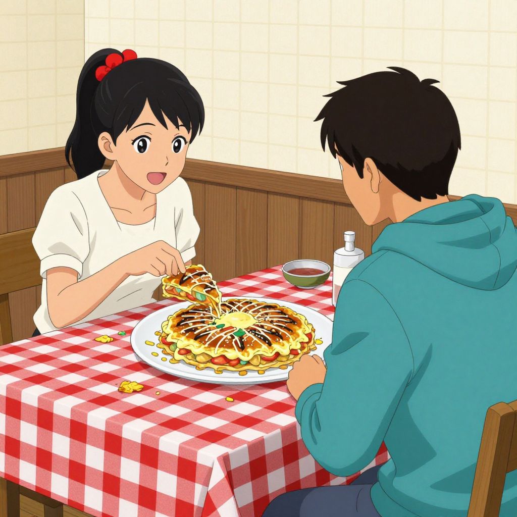 In this vibrant and detailed illustration, a Japanese couple is captured in a moment of shared enjoyment, sitting at a wooden table adorned with a red and white checkered tablecloth. The man, dressed in a teal hoodie, is turned away from the viewer, his attention focused on the large, mouth-watering okonomiyaki in front of him. The woman, with her hair tied up in a ponytail and adorned with red flowers, is facing the viewer, her hand reaching out to take a piece of the delicious-looking okonomiyaki. The okonomiyaki, with its layers of savory ingredients, sits on a white paper plate, surrounded by scattered crumbs and a few pieces of okonomiyaki on the table. The background features a grid-like pattern, adding depth and texture to the scene. The overall composition is balanced, with the couple and the okonomiyaki as the central focus, creating a warm and inviting atmosphere.