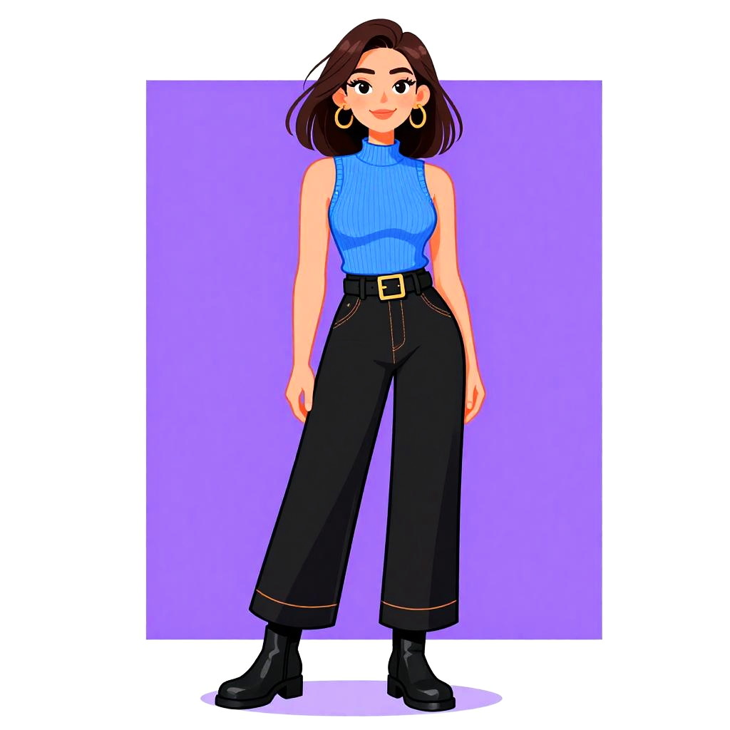 Digital illustration of a confident woman with dark hair in a ponytail, wearing a blue crop top, white cargo pants, and black heels.