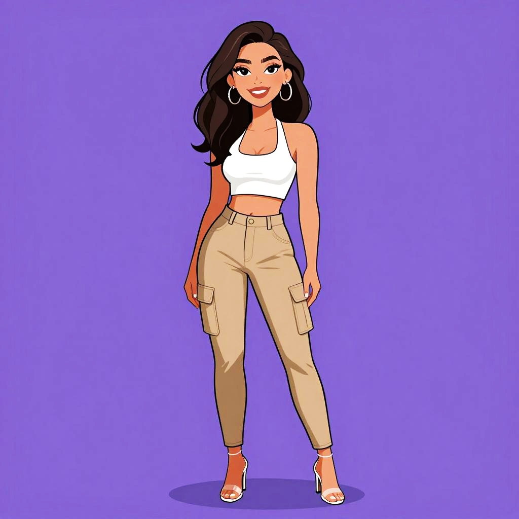 This is a digital illustration of a confident woman with a slim build and fair skin. She has long black hair tied in a high ponytail, and she wears large hoop earrings. Her outfit consists of a purple, sleeveless, halter-neck crop top that reveals her midriff, and high-waisted, cream-colored cargo pants with multiple pockets. She completes the look with black strappy high-heeled sandals. The background is completely white, making her the focal point of the image. The illustration style is bold and colorful, with clean lines and a slightly cartoonish aesthetic.