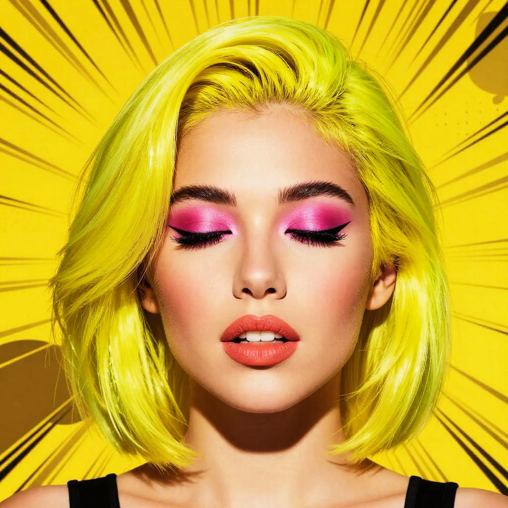 Realistic photo.Bold, high-contrast pop art portrait of a woman with sleek neon yellow hair, eyes closed, wearing vibrant pink eyeshadow and coral lipstick. The background features dynamic, radial lines and abstract shapes in a striking bright yellow palette, evoking a retro 80s aesthetic. The style is inspired by comic book art, with sharp lines and vivid color blocking. realistic photo