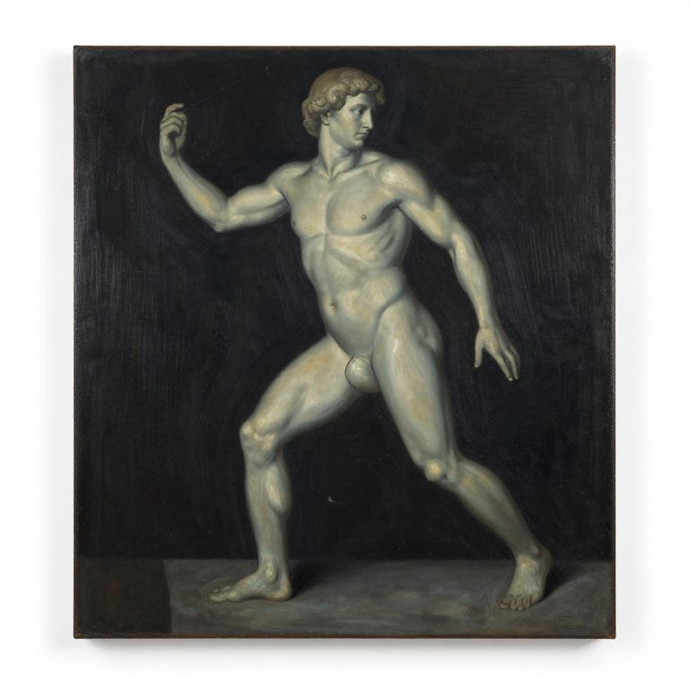 This is a classical-style oil painting of a nude male statue, resembling ancient Greek or Roman art. The statue depicts a muscular, well-defined male figure with curly hair, standing in a dynamic pose with his right arm raised and left arm slightly bent. His left leg is bent at the knee while the right leg is straight. The statue has a light greenish patina with shadows highlighting its muscular definition. It has a visible, detailed genital area. The background is dark, almost black, which accentuates the statue's form. The painting has a realistic, yet slightly idealized, representation of the human male physique.
