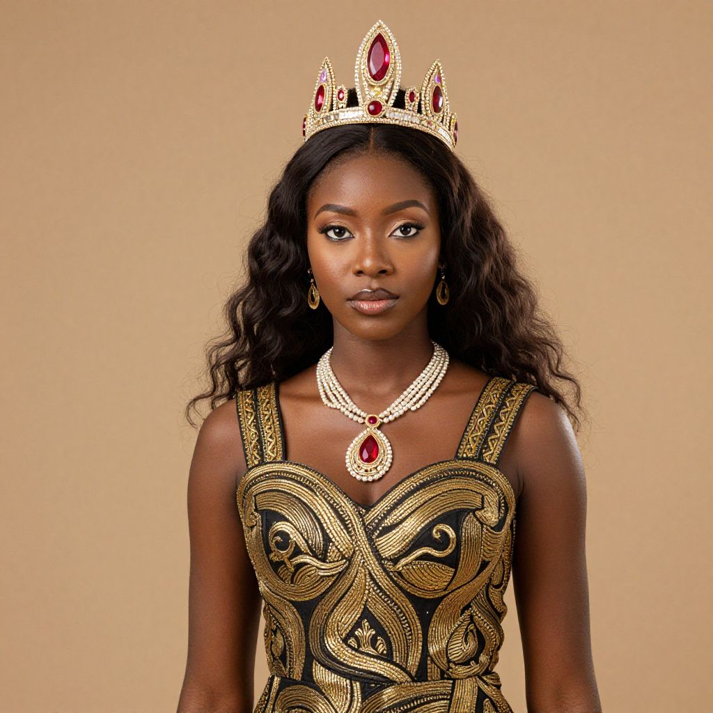 Photograph of a dark-skinned woman with long, wavy black hair wearing an ornate, gold and black patterned dress with intricate designs. She has a regal, gold crown with red gemstones on her head and matching red gemstone necklace and pendant. Her expression is serious and composed. The background is a solid, warm beige color. She is wearing simple gold hoop earrings, and the overall style is elegant and royal. The image has a soft focus, highlighting her face and upper body.