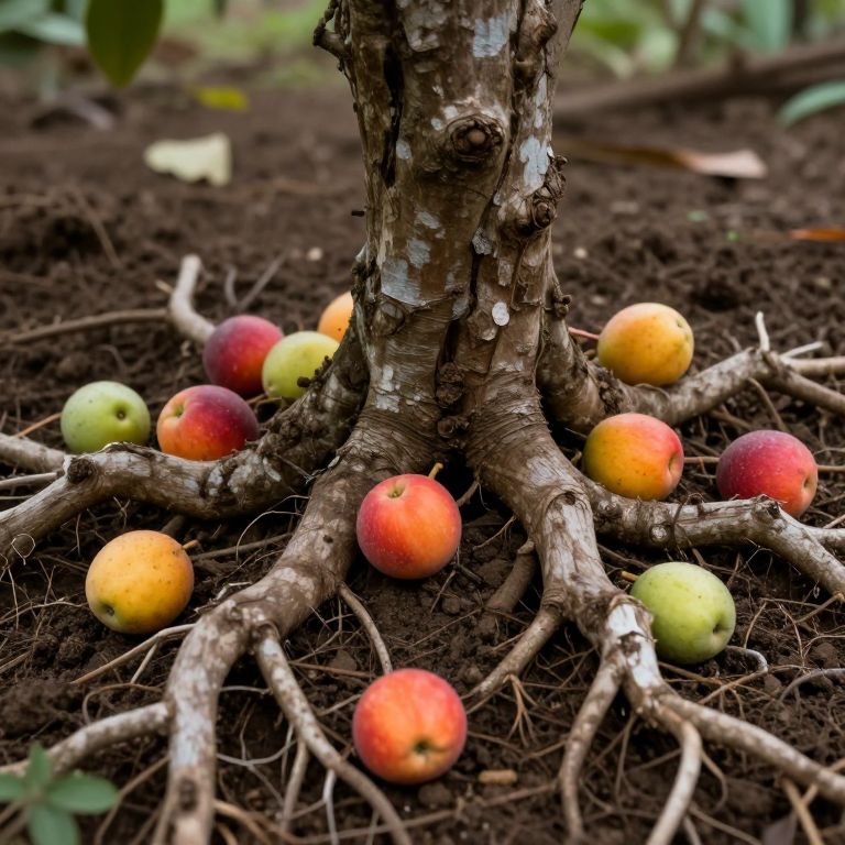 Photograph of a tree with textured bark, roots spreading out, surrounded by colorful apples (red, yellow, orange) on dark, rich soil.