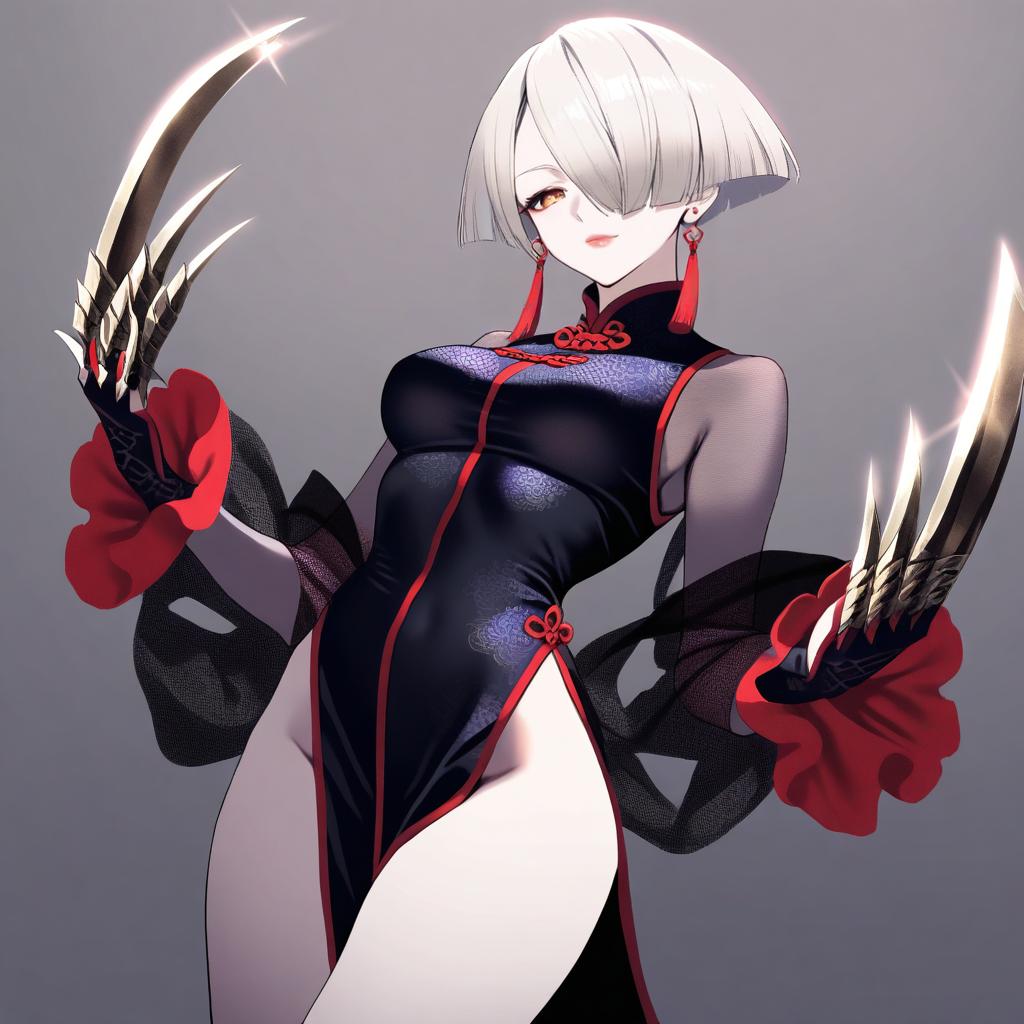 A.k.i. (street fighter), street fighter, 1girl, pale skin, red lips, mole under mouth, red eyes, hair over one eye, short hair, white hair, grey hair, china dress, chinese clothes, tassel earrings, claw (weapon), claw ring, by artist chitosezaka suzu, animagine