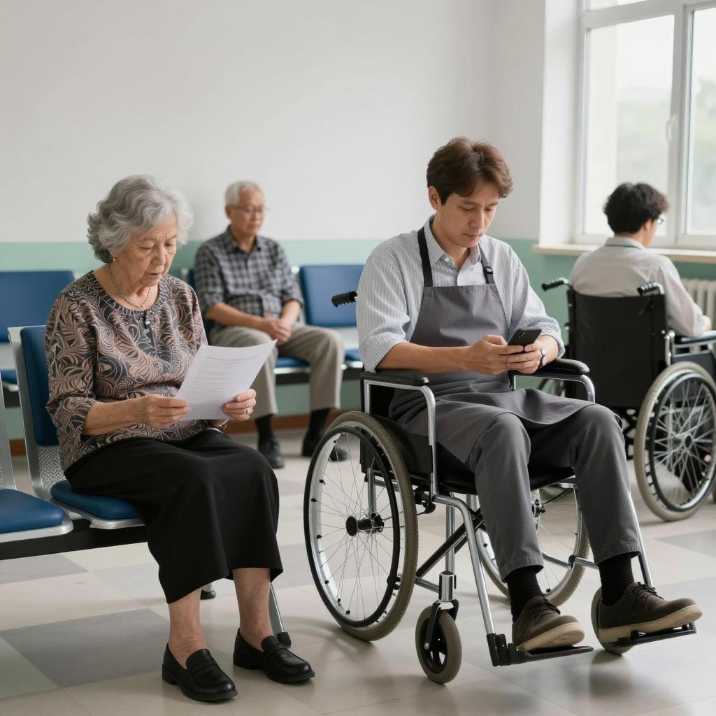 A group of elderly people in a classroom-like setting. They wear white shirts and sit in rows. Foreground: bald elderly man with furrowed brow, middle-aged man with curly brown hair, elderly man with white hair and wrinkles. Background: diverse elderly individuals, some with white hair, others with brown or gray hair. Neutral expressions, focused gaze. Light gray walls, simple design. 12 people in total.