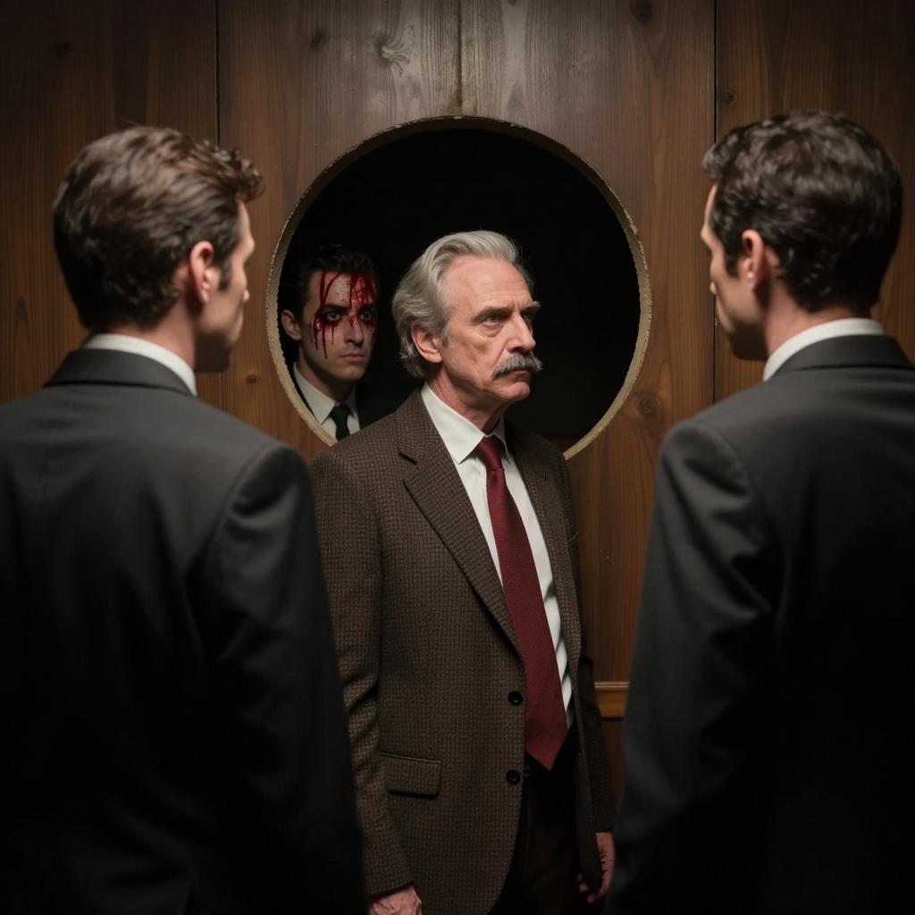 Man with slicked-back hair, wearing a dark suit and tie, smokes a cigarette. He sits at a bar, facing left. Three older men, one with a hat, stand behind him. Dimly lit bar with framed pictures and jackets on the right. Warm, low lighting.
