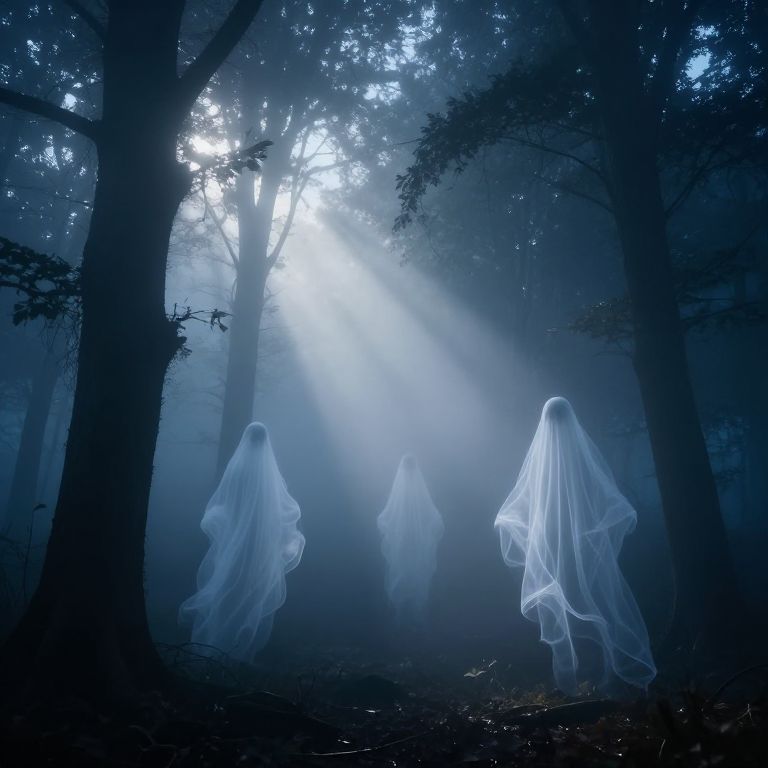 Photograph of a misty, moonlit forest with four ethereal, white ghostly figures floating among tall, dark trees. The ghosts, with flowing, translucent robes, are evenly spaced across the forest floor. Bright beams of moonlight pierce through the dense fog, creating a haunting, mystical atmosphere. The forest floor is covered in shadows and scattered leaves, while the trees' trunks are silhouetted against the glowing background. The overall color palette is dominated by deep blues and whites, enhancing the eerie, otherworldly feel of the scene.