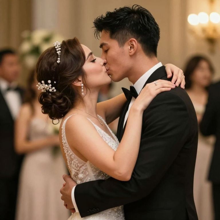 In a tender embrace, two souls unite in a moment of timeless joy, their first kiss symbolizing the promise of love and the delicate dance of connection amidst the whispers of celebration and the warmth of shared dreams.