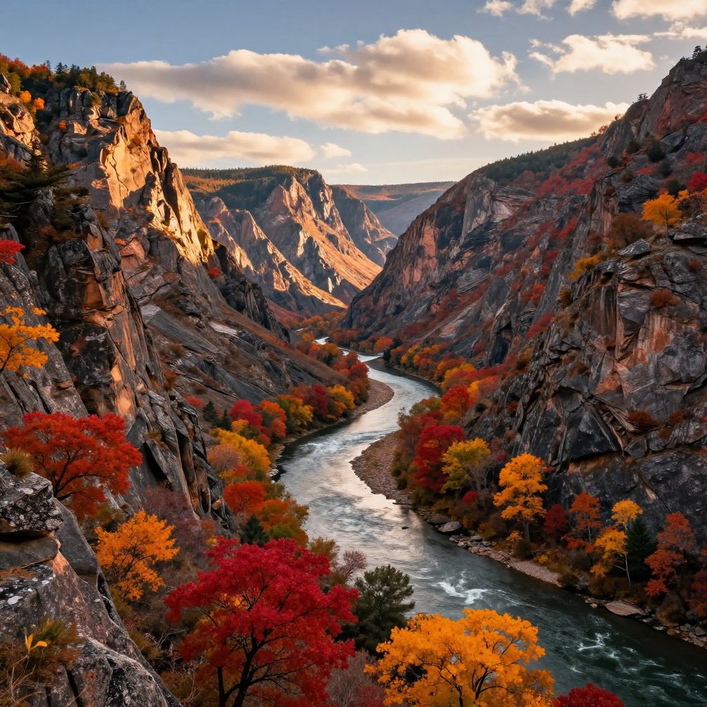 A breathtaking river winding through a rugged canyon with sharp peaks and colorful autumn foliage. The scene is illuminated by warm late afternoon sunlight, highlighting vivid red, orange, and yellow trees alongside steep rocky cliffs. Soft clouds drift in the sky above, enhancing the natural beauty of this high-resolution landscape view.