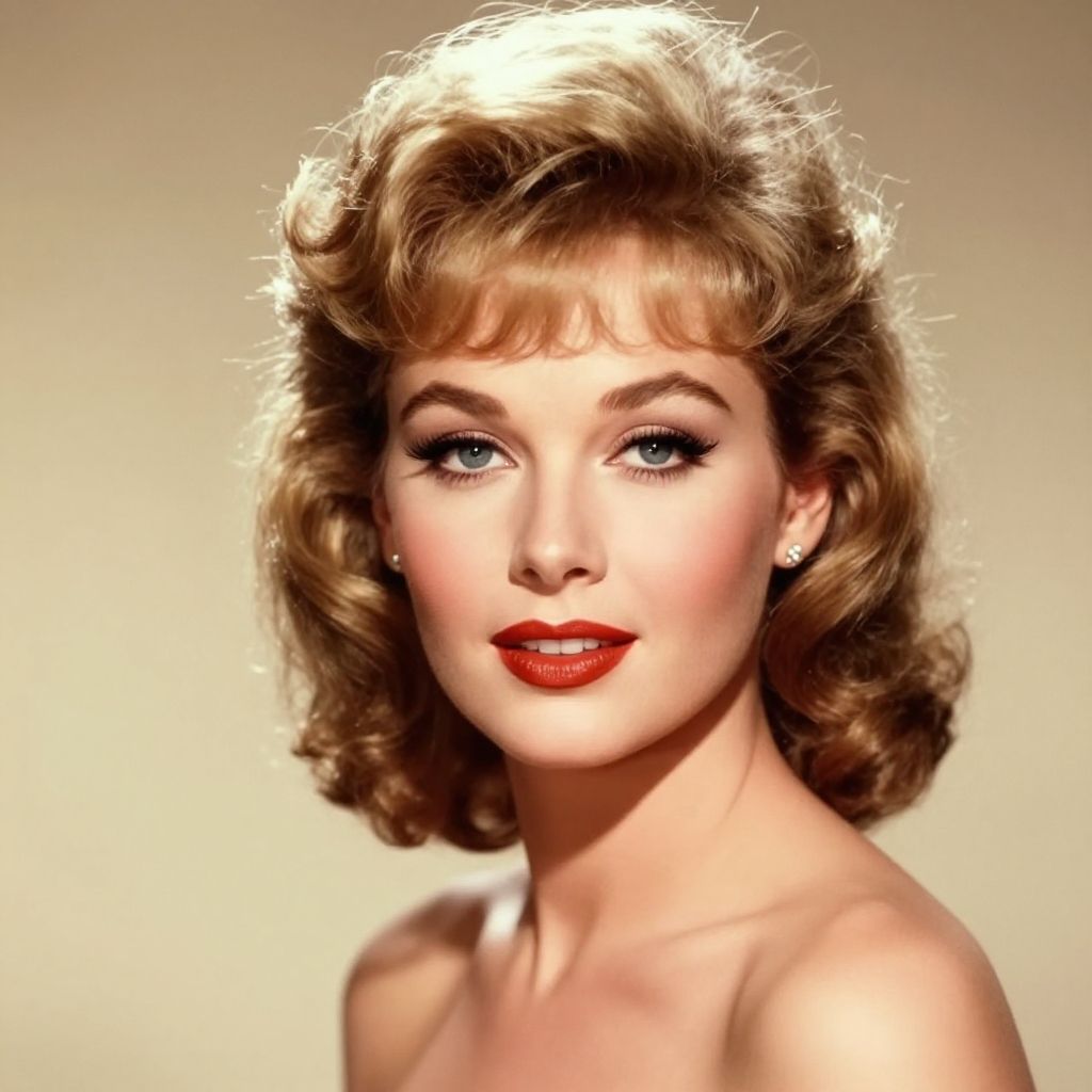 Photograph of a fair-skinned woman with classic 1950s glamour styling. She has voluminous, curly, light brown hair with soft waves, and vivid blue eyes accentuated by dark eyeliner and mascara. Her full, red lips are perfectly shaped, and she wears small, pearl stud earrings. Her bare shoulders suggest a strapless top. The background is a simple, gradient beige, putting full focus on her face. The lighting is bright, highlighting her hair's texture and her smooth, flawless complexion. The overall style is reminiscent of vintage Hollywood glamour photography.