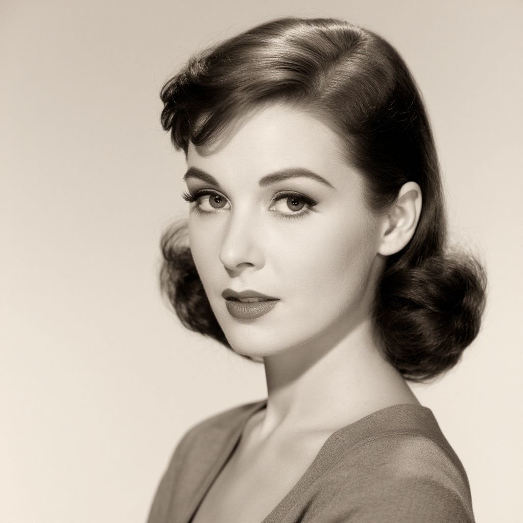 Photorealistic portrait of a fair-skinned woman with vintage 1950s-style, wavy blonde hair, bold red lipstick, and blue eyes