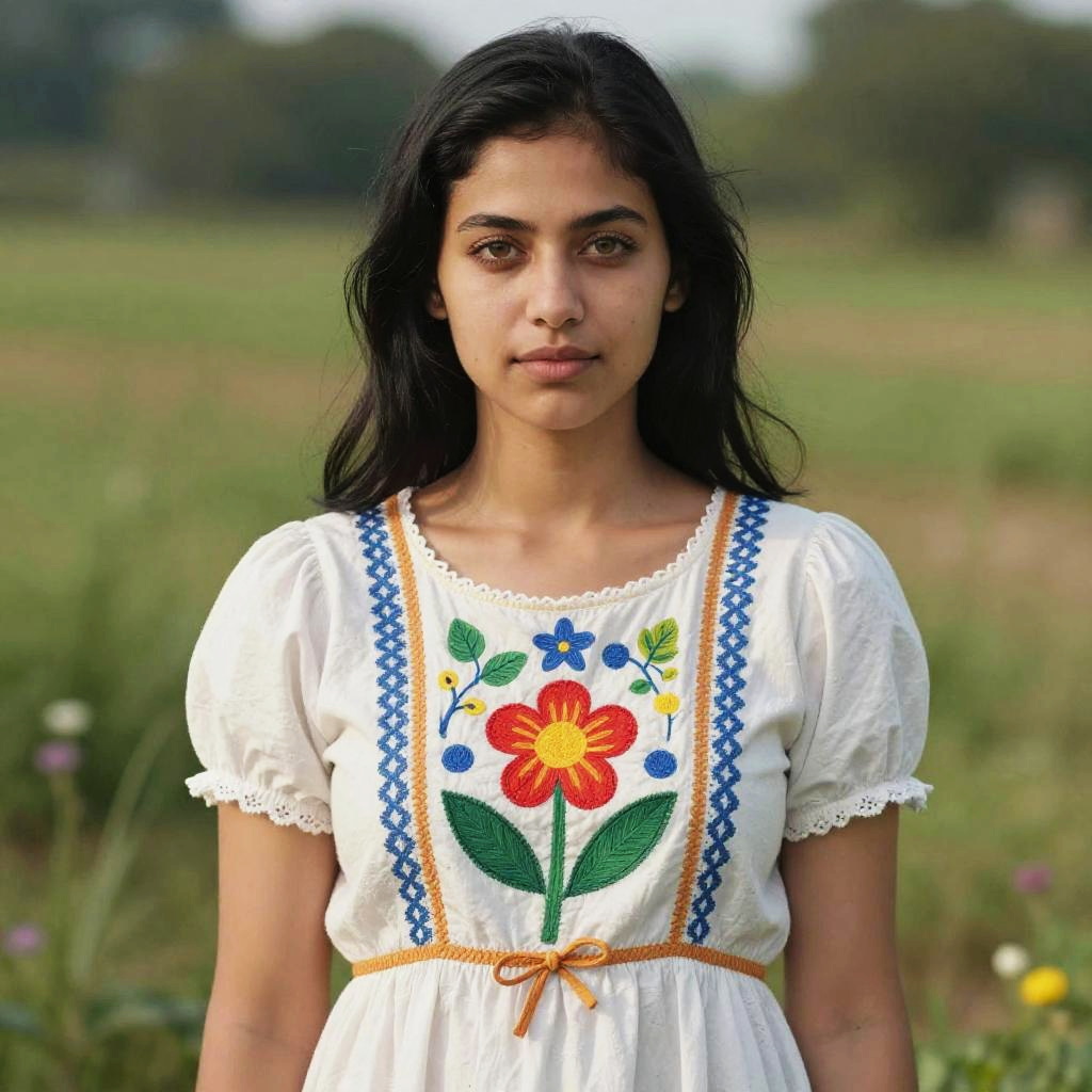 Realistic photo.Portrait by Mark Keathley of a cute 26-year-old woman with black hair, hazel eyes, wearing a simple farm dress, painted with vibrant colors and realistic details realistic photo