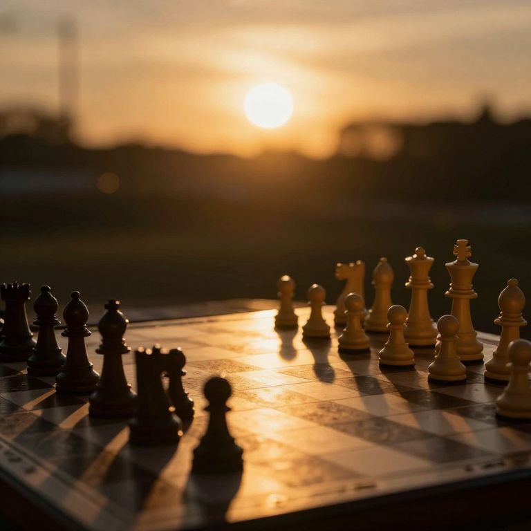 Under the watchful gaze of a golden sun cloaked in enigmatic shadows, a celestial chessboard unfolds, its luminous pieces poised in silent battle, evoking a profound sense of cosmic tension and the eternal dance of light and shadow.
