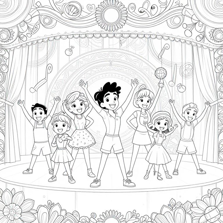 Glee coloring pages showcasing animated characters joyfully performing on a high school auditorium stage, detailed floral and musical instrument patterns woven into the background, perfect for engaging coloring with a theme of happiness and teamwork.