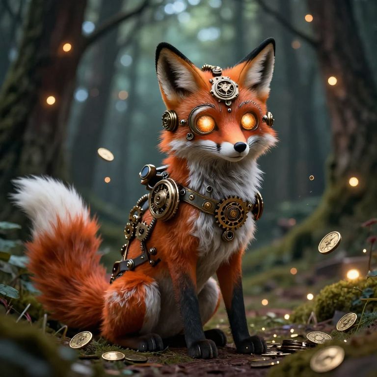 A steampunk fox adorned with glowing mechanical eyes and intricate cogs sits amidst a mystical forest, surrounded by enchanted lights and shimmering coins that seem to dance with the rhythm of time.