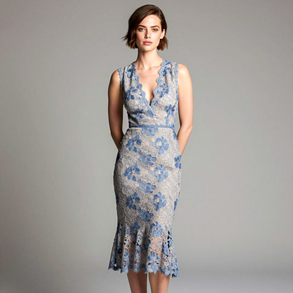 Artistic roller skating, photograph of a young woman, standing on a roller skate, wearing a sleeveless, blue and silver patterned dress with a high neckline, brown hair in a bun, red lipstick, neutral expression, dimly lit background with dark pink curtains, indoor setting, wooden floor, daytime, fashion style, full body shot, centered, minimal shadows, casual pose