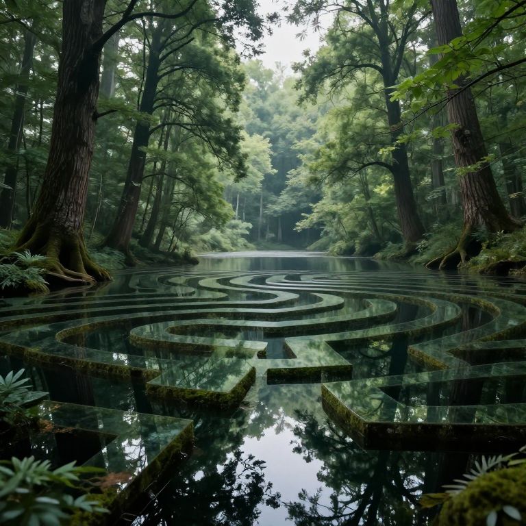 A labyrinthine lake of floating mirrors reflects alternate versions of a whispering forest, distorted and dancing with the voices of forgotten gods.
